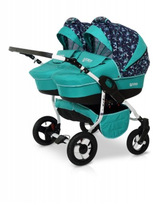 Детская коляска Verdi Twin в цвете Бирюза с серым для двойни - ультрасовременная модная коляска. Производитель позаботился, чтобы коляска была не только модная, но и практичная. Рама изготовлена из алюминия, передние колёса с функцией поворота на 360 градусов облегчают управление для мамы. А надувные колёса уменьшают ощущение тряски в поездках по неровным дорогам. На задней оси тормоз посередине, что улучшает функциональность. Ваши малыши будут находиться в комфорте и уюте в любую погоду и время года, благодаря натуральным тканям.