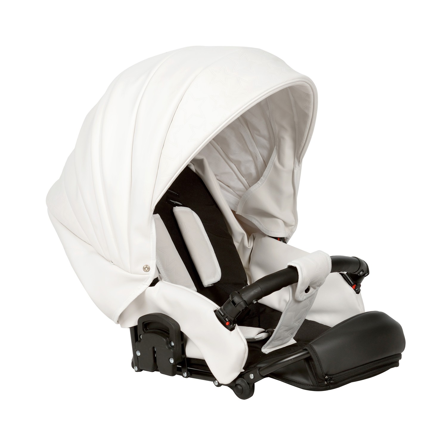 Прогулочный блок также выполнен из экокожи. Объемный капюшон также имеет вентиляционную секцию из сетки для жаркой погоды, а теплая накидка на ножки - ветрозащитный отворот. Спинка регулируется в 4 положениях - от полностью вертикального до горизонтального. Сидение раскладывается в удобное спальное место 84 х 35 см. Капюшон пристегвается к чехлу молнией - выглядит эстетично и надежно защищает от поддуваний. Для безопасности предусмотрены 5-точечные ремни, которые можно установить в 3 положения по высоте. На подстраховке - съемный бампер и мягкая межпаховая перемычка на кнопке. Система One Touch позволяет без труда менять положение блока прямо на прогулке за несколько секунд, устанавливая его лицом по ходу движения или наоборот, если малыш соскучился по маме.