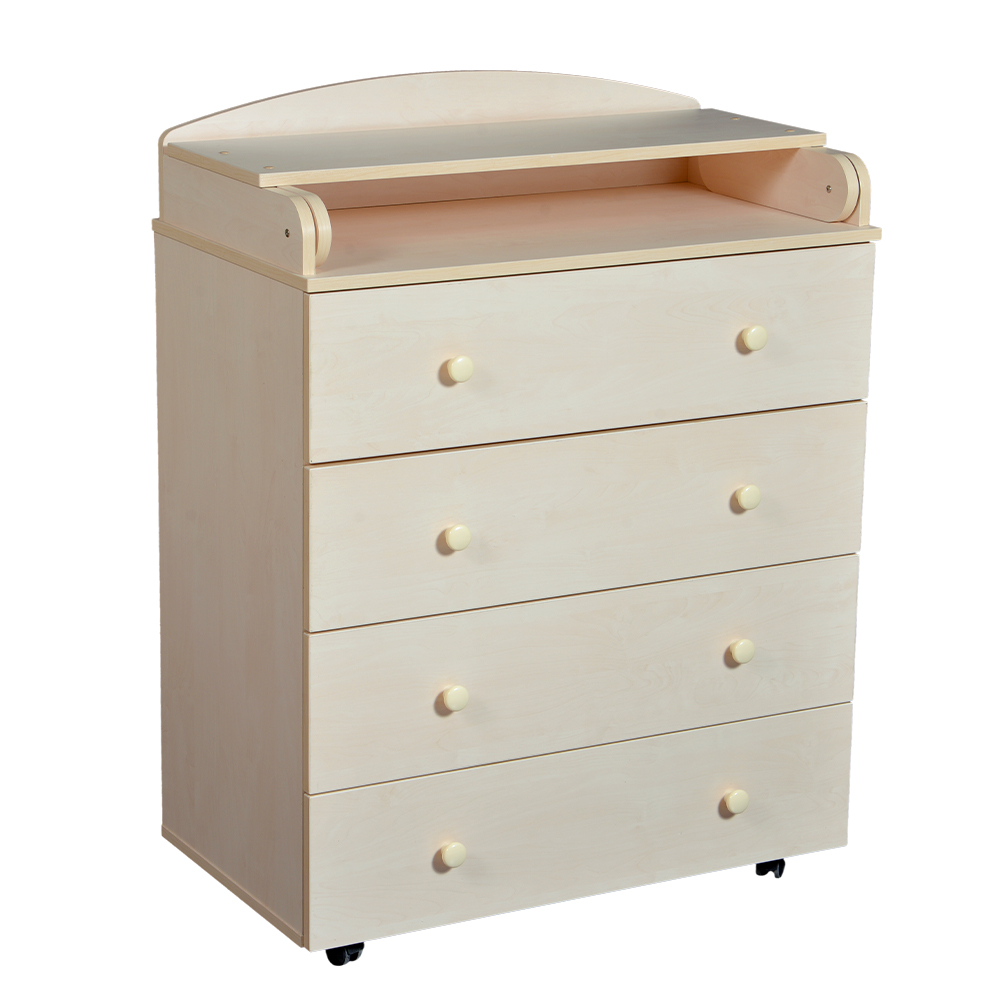 Передний край крышки комода, которая является одновременно основой пеленального столика, также как откидная доска, обработан прорезиненным шпоном. Закругленные детали призваны защитить ребенка, они гармонично смотрятся с фигурной задней стенкой-ограничителем, которая сразу привлекает внимание, благодаря интересной форме.