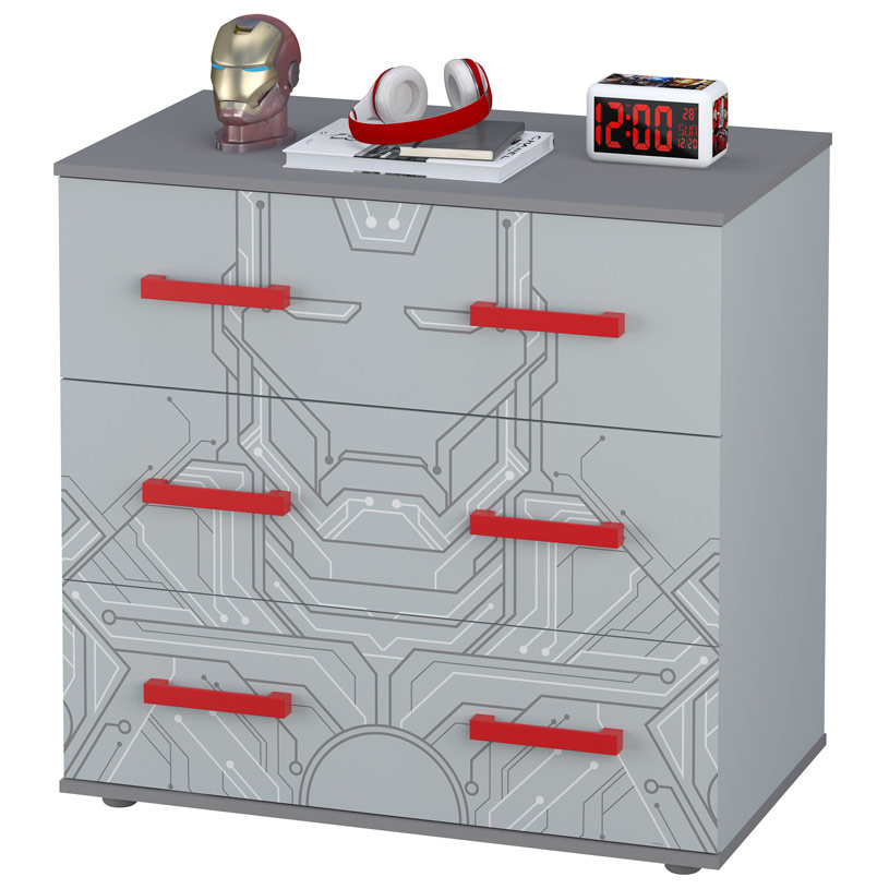 Комод Polini kids Marvel 3295 Железный человек выполнен в сером цвете, который дополняют яркие красные ручки удобной формы.