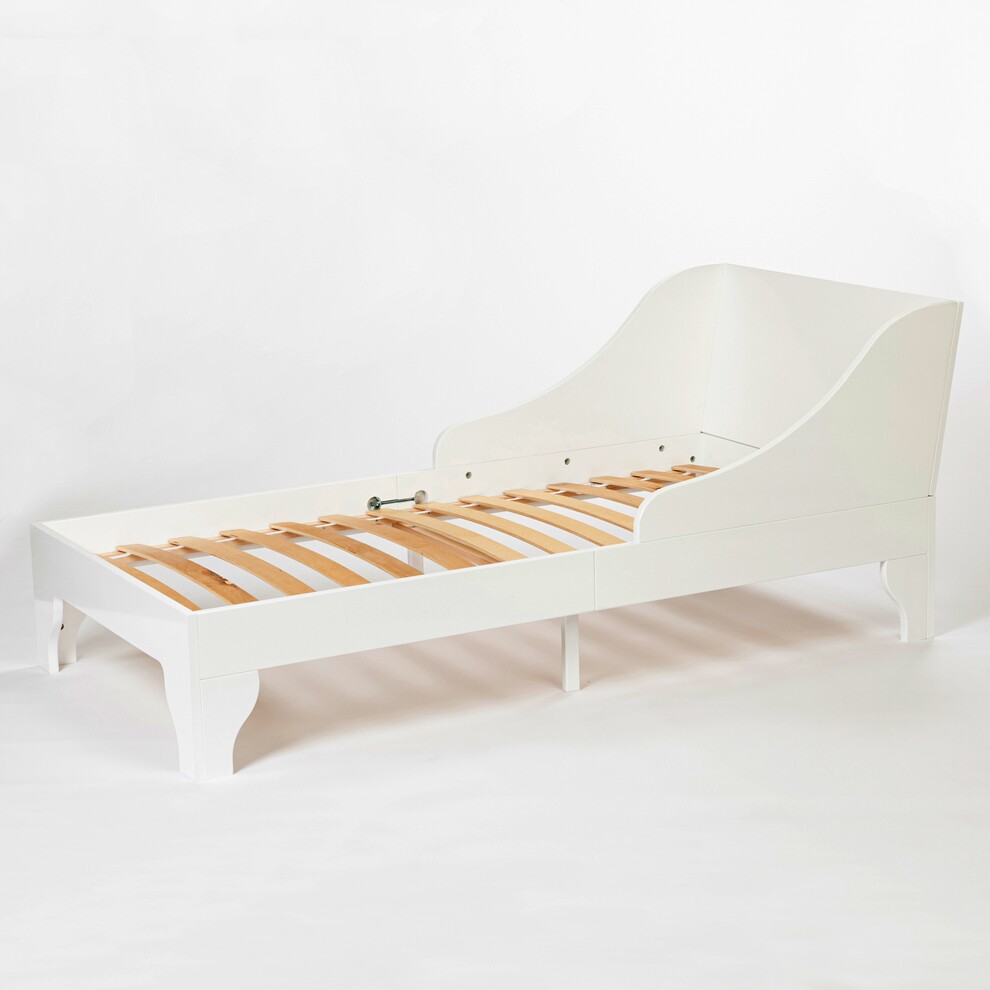 Каркас кровати изготовлен из твердых и устойчивых к повреждениям сортов бука. Ложе состоит из изогнутых реек, изготовленных из массива лиственницы – такая конструкция обеспечивает естественную вентиляцию матраса и придаёт изделию ортопедический эффект – это очень важно для ребёнка в период его активного роста и формирования позвоночника.